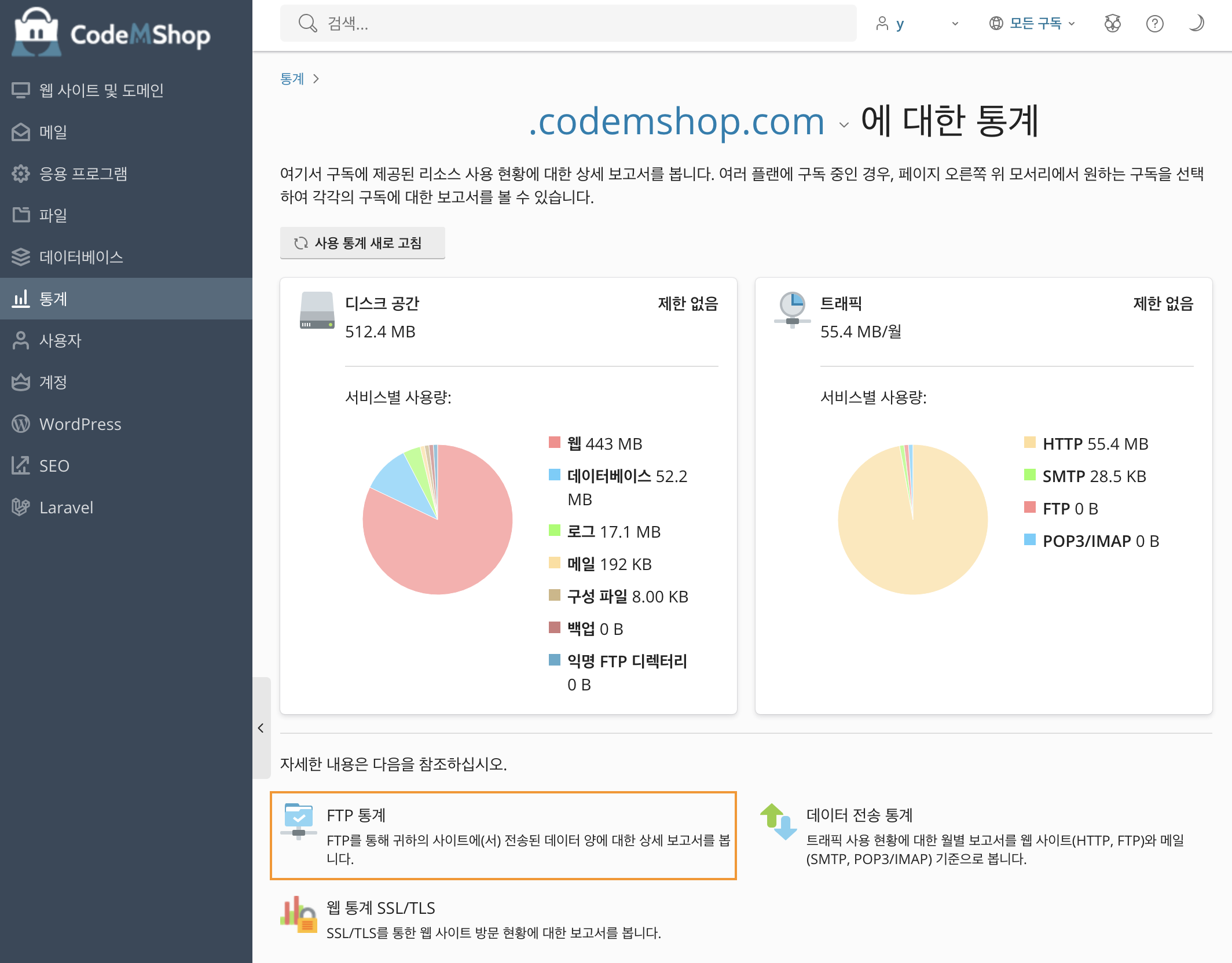 호스팅 관리 패널의 통계 메뉴에서 FTP 통계를 클릭하여 FTP를 통해 전송된 데이터 양에 대한 상세 보고서를 확인할 수 있습니다.