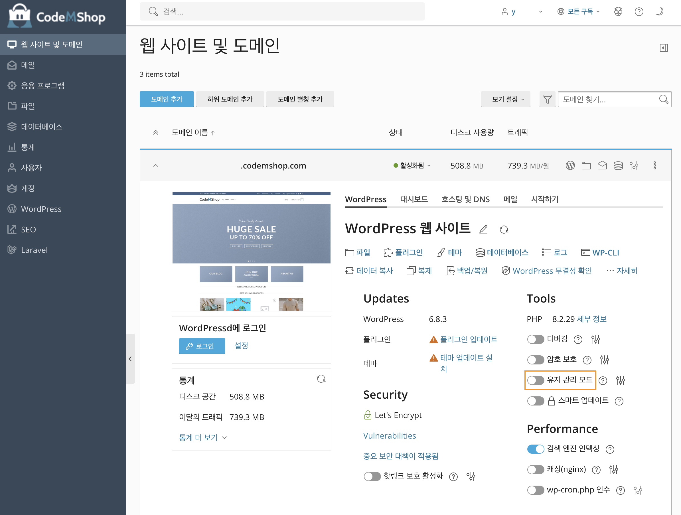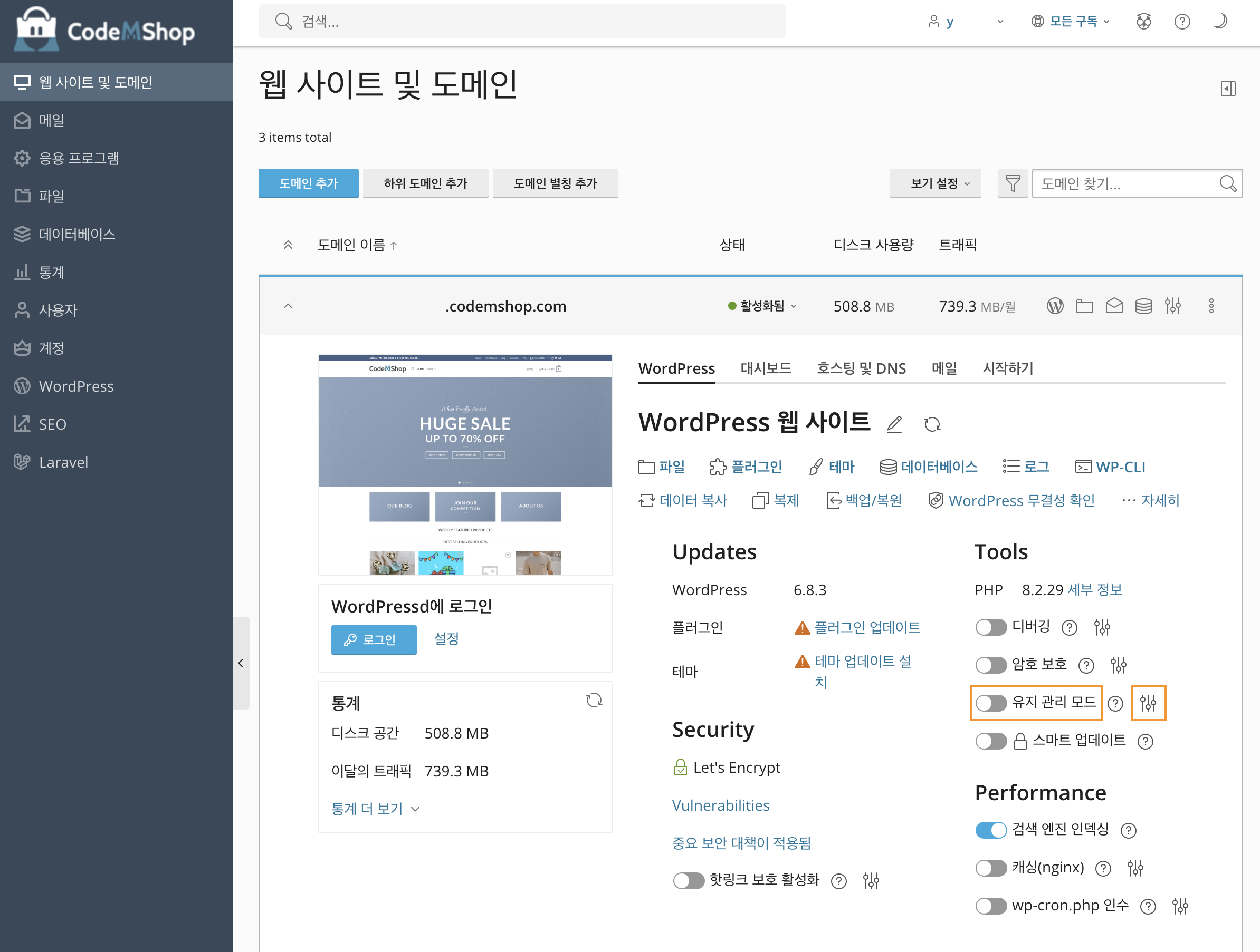 호스팅 패널의 [웹 사이트 및 도메인 > WordPress(탭)]의 도구 영역에서 활성화 하거나, 우측 설정 아이콘을 클릭하여 설정할 수 있습니다.
