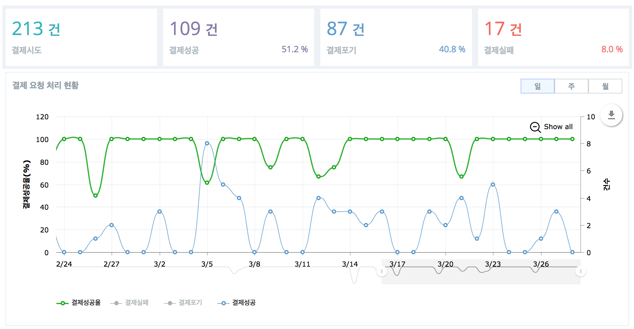 결제 통계 화면에서 쇼핑몰의 결제 기능이 안정적으로 동작되고 있는지 한눈에 확인할 수 있습니다.