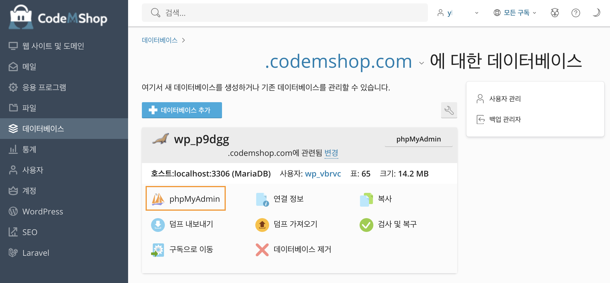 호스팅 관리 패널의 데이터베이스 메뉴에서 phpMyAdmin을 클릭합니다.
