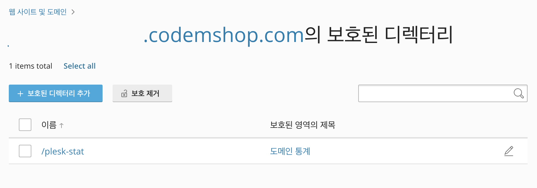 설정 경로는 [웹 사이트 및 도메인 > 암호로 보호된 디렉터리] 입니다.