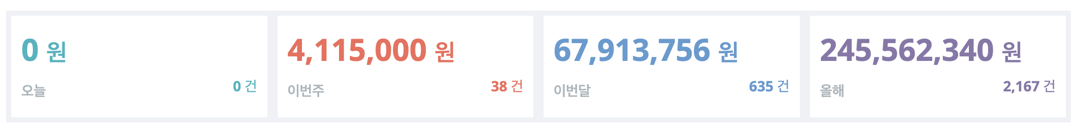 오늘, 이번주, 이번달, 올해의 매출 건수와 매출액을 확인할 수 있습니다.