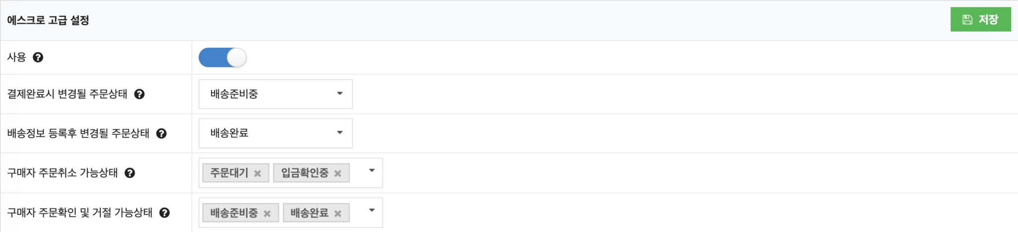 [심플페이 결제관리 > 결제설정 > 토스페이먼츠 설정 > 기본설정]에서 결제수단 영역에 에스크로 계좌이체 추가 후 저장 버튼을 클릭해야 설정 가능합니다.