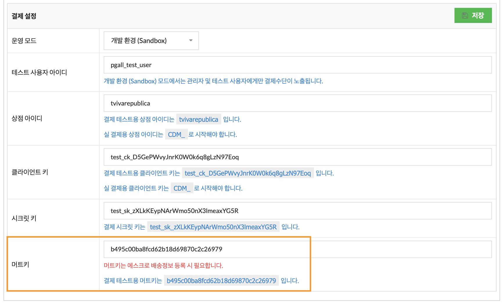 결제수단에 에스크로 계좌이체를 추가하면, 결제 설정 영역에 머트키 입력 영역이 활성화됩니다.