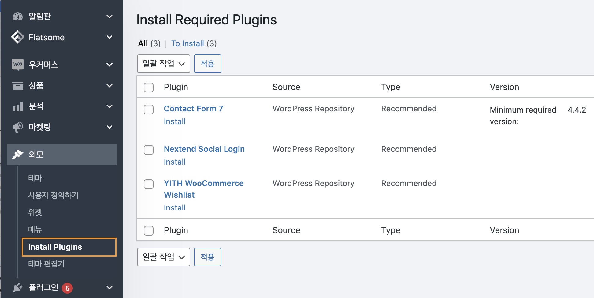 관리자 메뉴 [모양 > Install Plugins]에서 Required으로 된 플러그인이 설치, 업데이트가 되었는지 확인합니다.