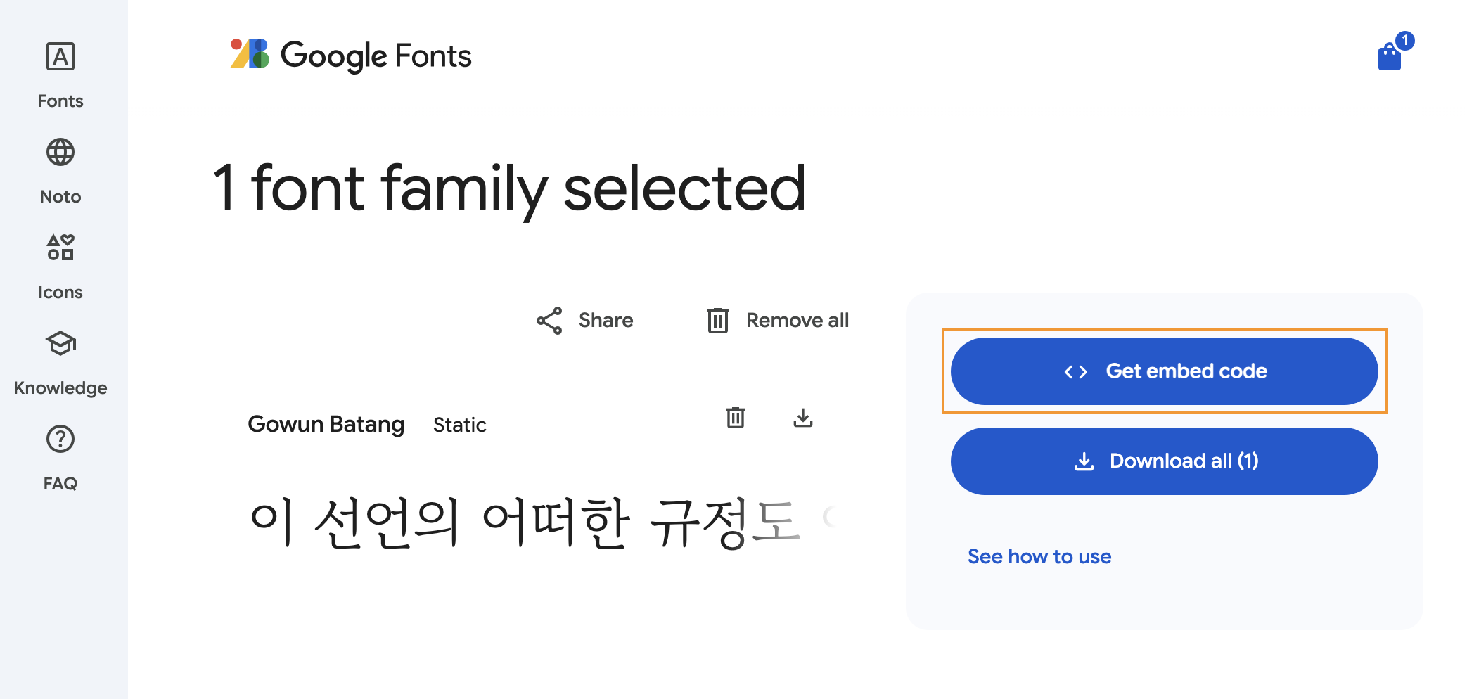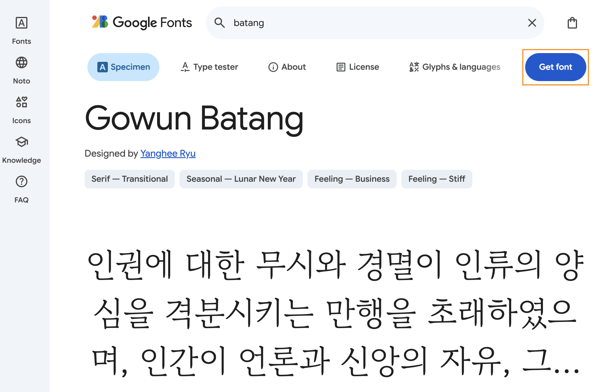 Google Fonts 사이트로 이동하여 이용을 원하는 폰트를 검색한 후 우측의 Get Font 버튼을 클릭합니다.