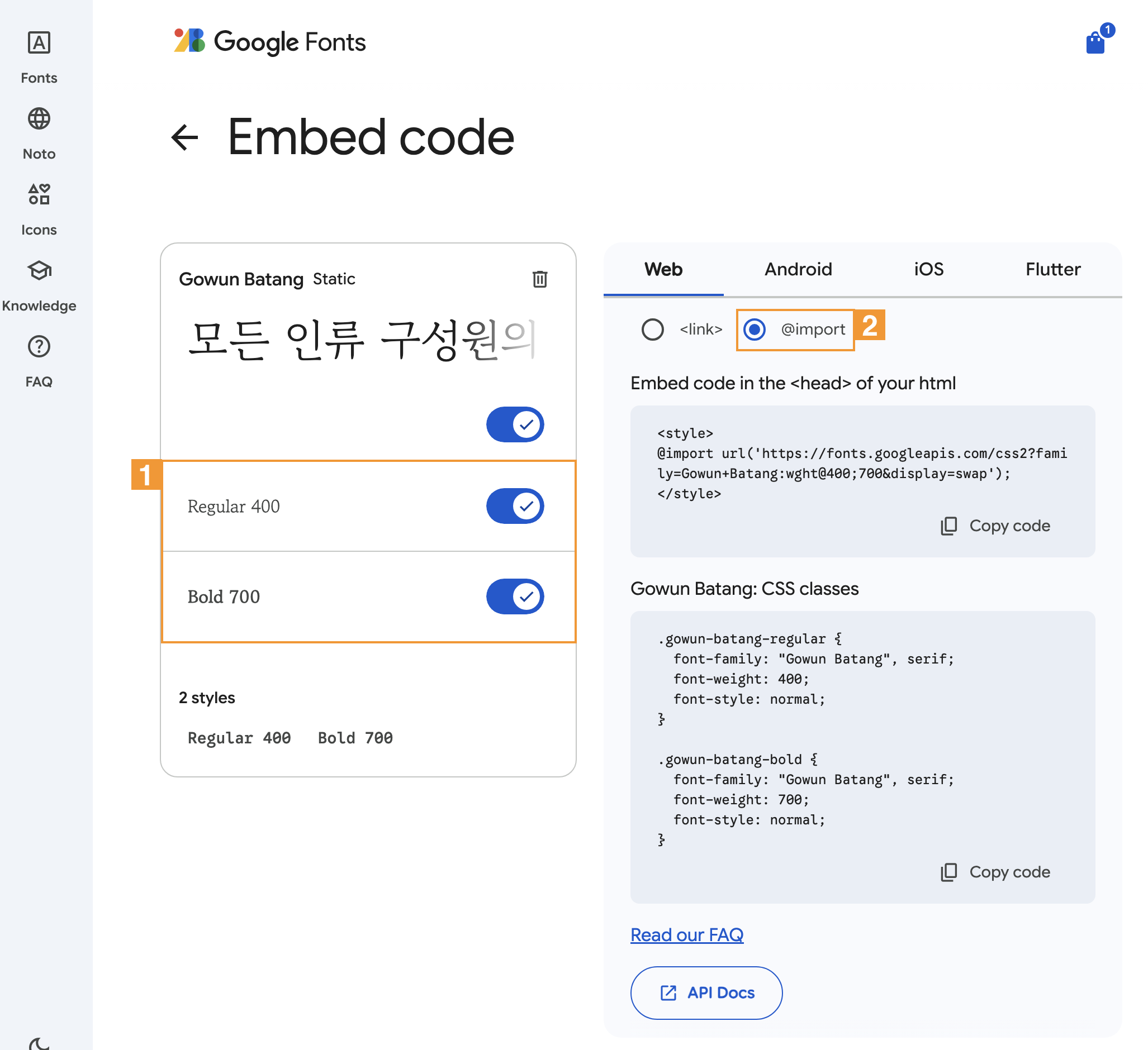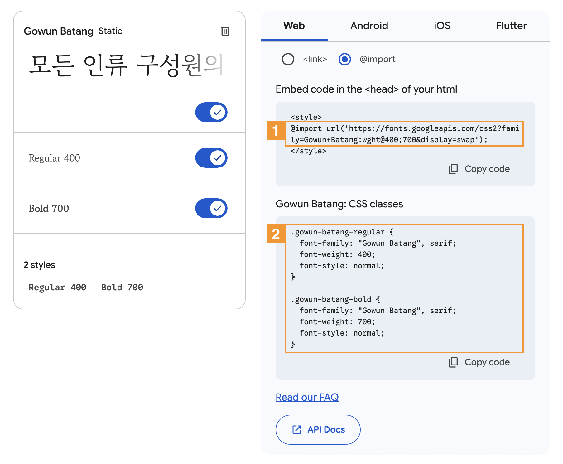1번 영역에서 사용을 원하는 스타일을 선택한 후, 2번 영역에서 @import를 선택합니다.