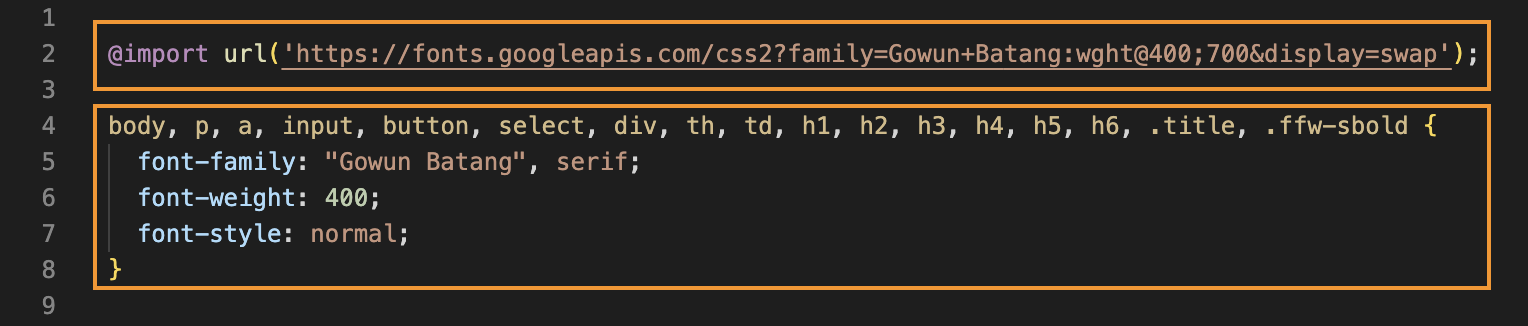 CSS 파일에서 @import 링크 추가 시 아래에 추가하면 웹 폰트가 정상적으로 로드되지 않기 때문에 파일 상단에 추가해야 합니다.