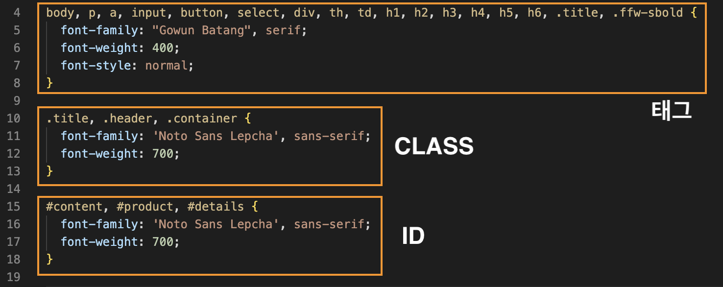 2번 영역을 참고하여 태그, id, class에 웹 폰트를 적용합니다.