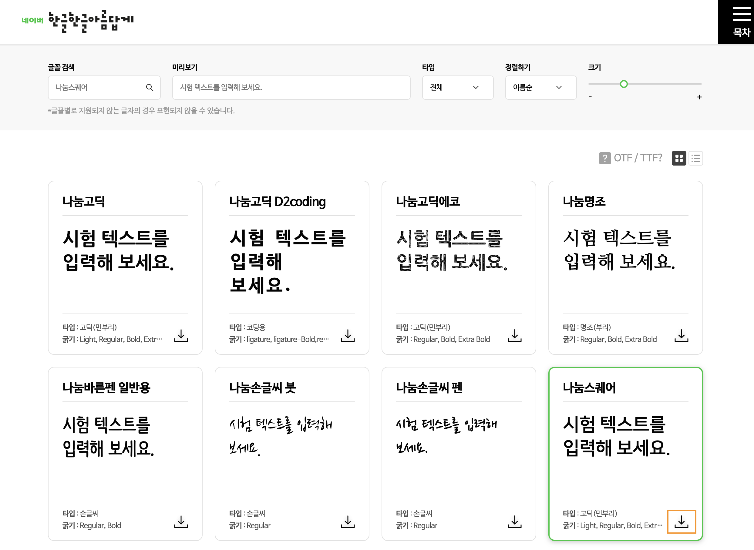 네이버 나눔 글꼴 모음에서 다운로드 아이콘을 클릭하여 나눔 스퀘어 웹 폰트를 다운로드 합니다.