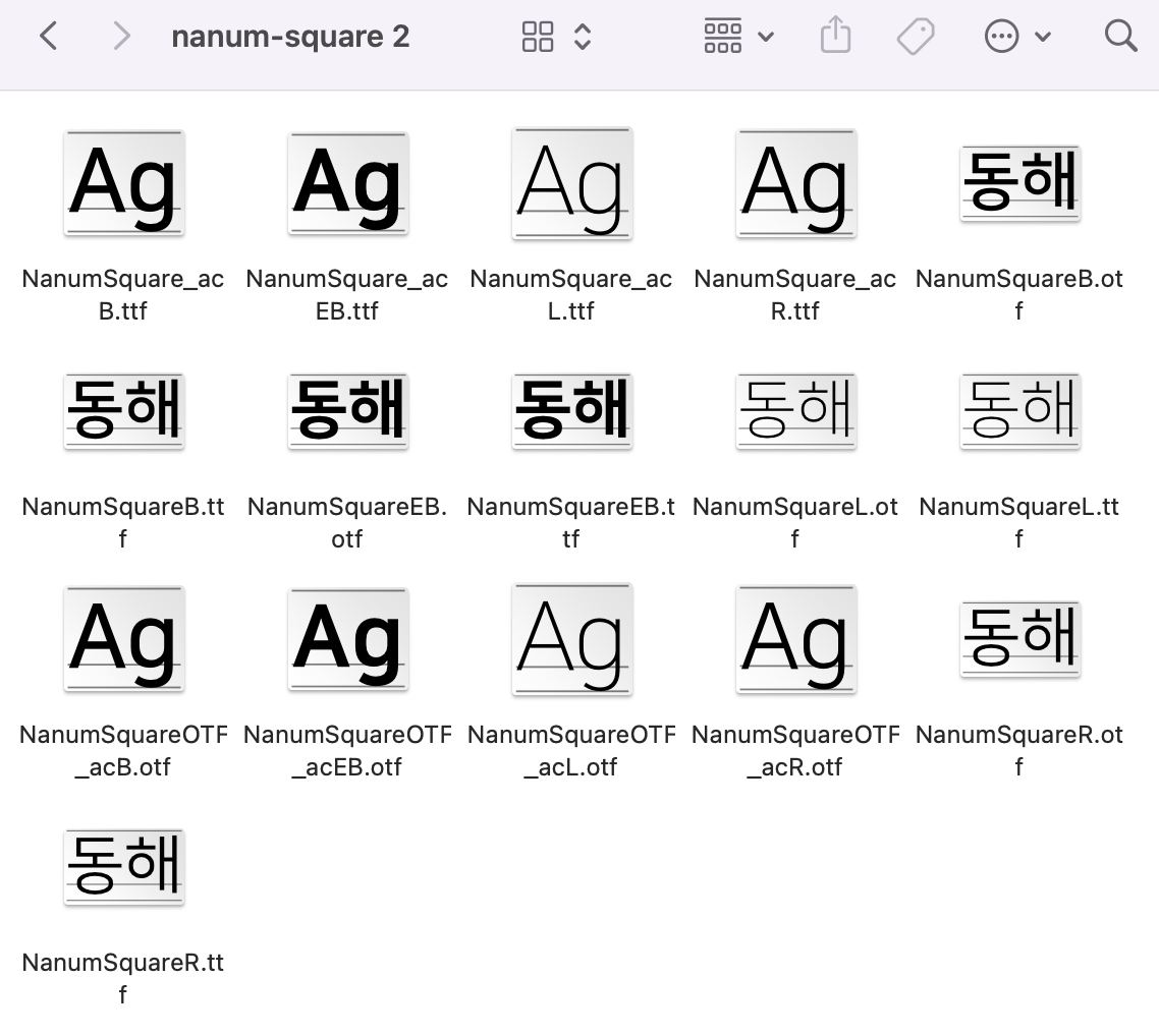 다운로드 후 파일을 확인하면 ttf 파일과 otf 파일 등 여러개의 파일을 확인할 수 있습니다.