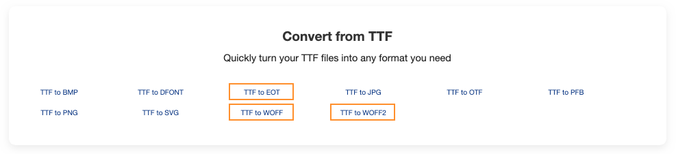 사이트 하단의 Convert from TTF 영역에서 각 형식으로 변환할 수 있습니다.