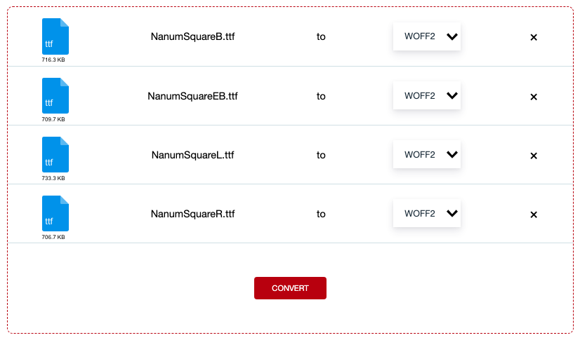Font Converter 사이트에서 ttf 파일을 eot, woff, woff2 파일로 각각 변환해야 합니다.