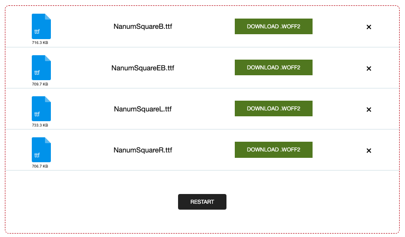브라우저 별 웹 폰트 지원 상황이 다르기 때문에 폰트 파일을 브라우저 별로 변환해야 합니다.