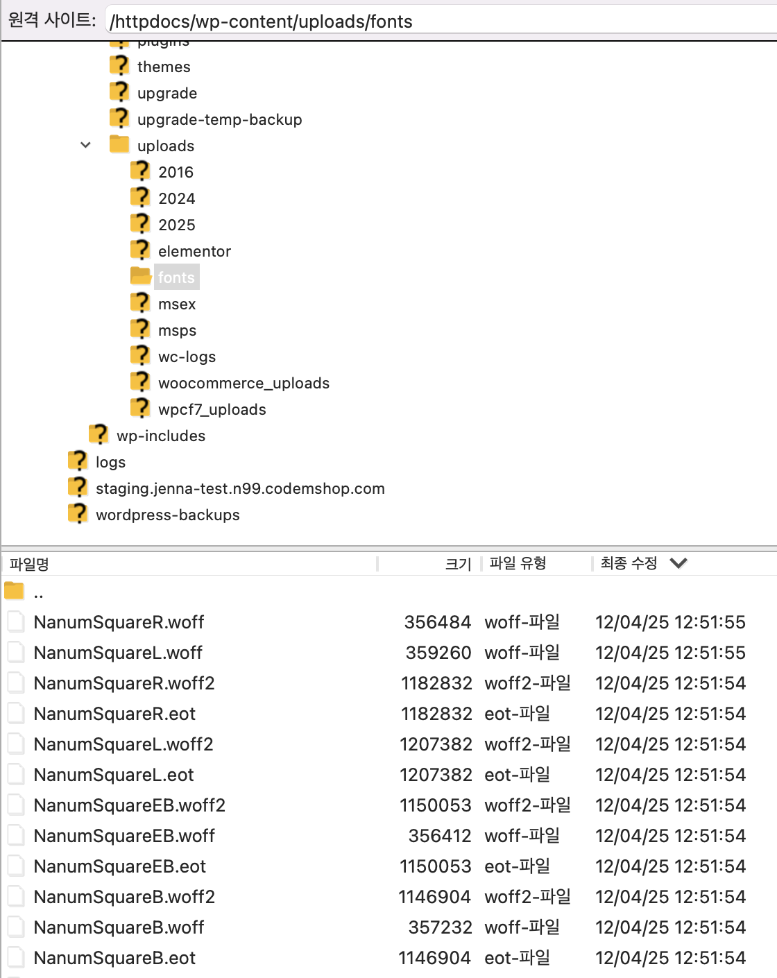 FTP 프로그램을 이용하여 사이트에 접속한 후 /wp-content/uploads 경로에 fonts 폴더를 생성합니다.