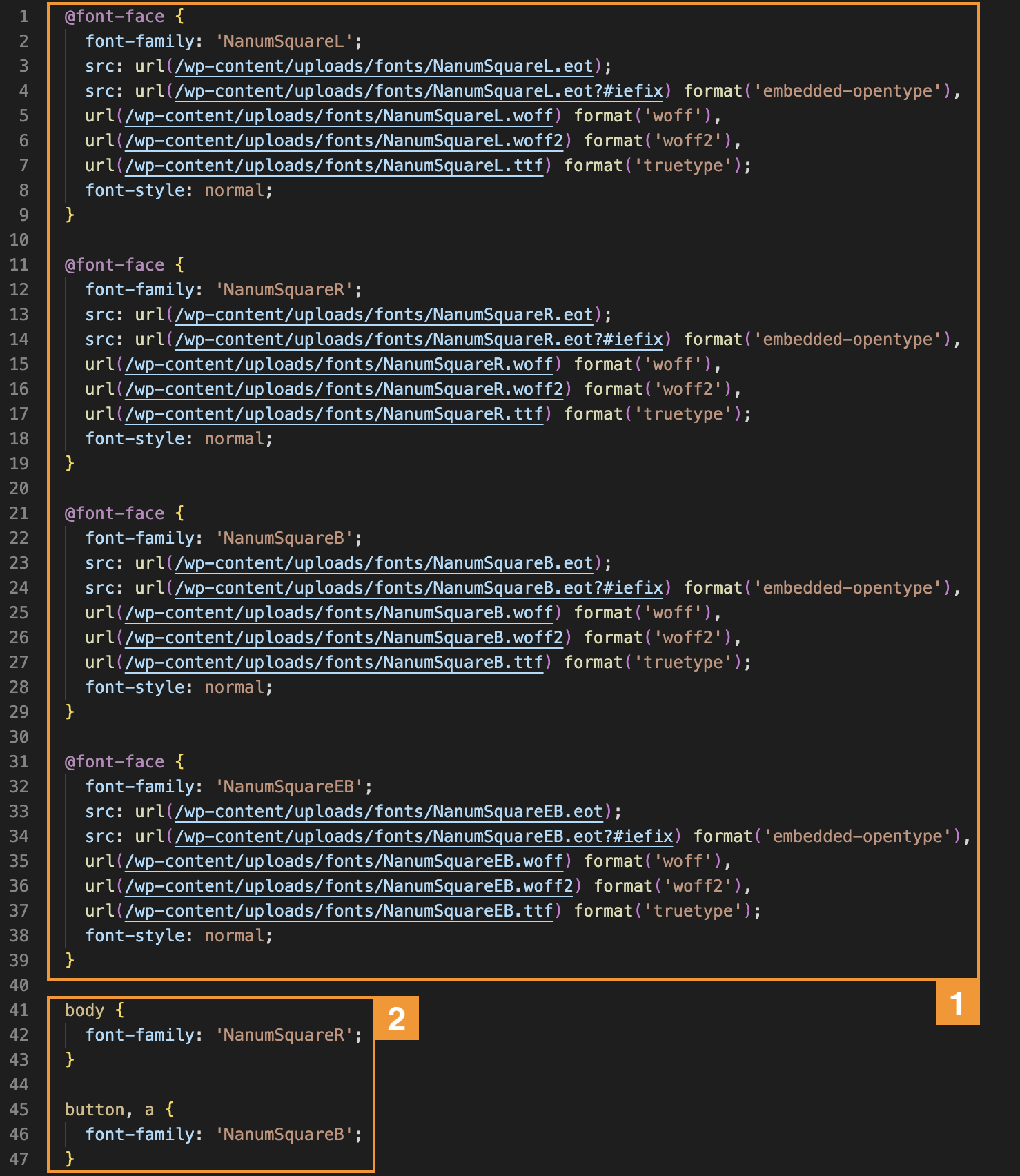 @font-face { font-family: 'NanumSquareL'; // 사용할 웹 폰트의 이름입니다. src: url(/wp-content/uploads/fonts/NanumSquareL.eot); // IE9 Compat Modes src: url(/wp-content/uploads/fonts/NanumSquareL.eot?#iefix) format('embedded-opentype'), // IE6-IE8 url(/wp-content/uploads/fonts/NanumSquareL.woff2) format('woff2'), // Super Modern Browsers url(/wp-content/uploads/fonts/NanumSquareL.woff) format('woff'), // Pretty Modern Browsers url(/wp-content/uploads/fonts/NanumSquareL.ttf) format('truetype'); // Safari, Android, iOS font-style: normal; // 웹 폰트의 스타일입니다. }