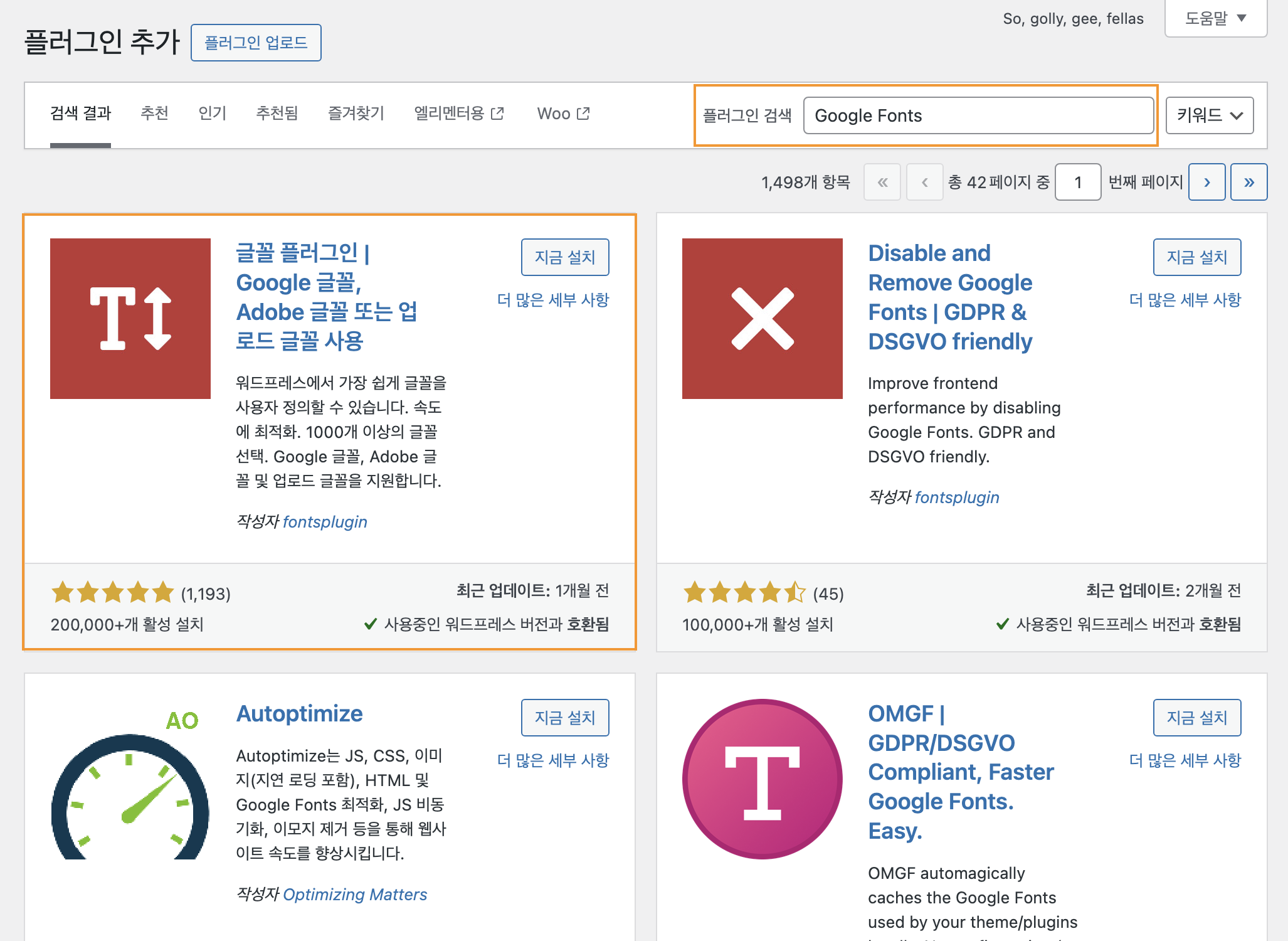 관리자 메뉴 [플러그인 > 플러그인 추가]에서 ‘Google Fonts’를 검색한 후 지금 설치 버튼을 클릭하여 플러그인을 설치 및 활성화합니다.