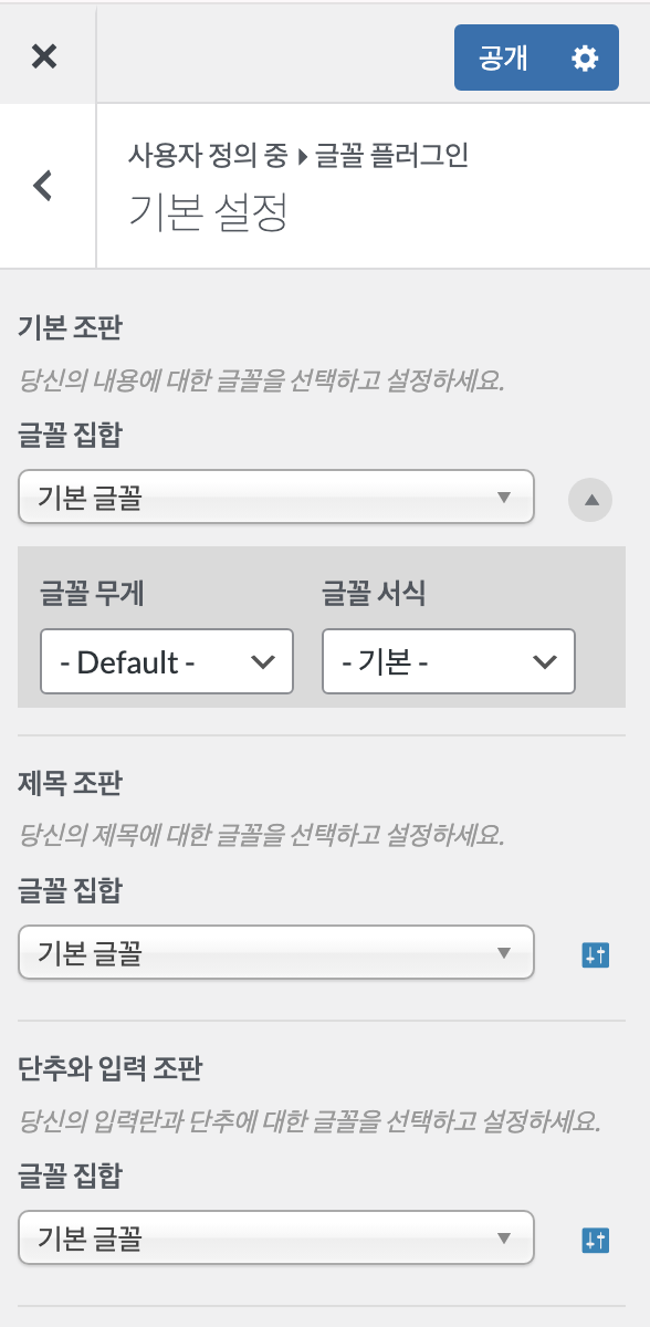 기본 설정에서는 기본, 제목, 버튼에 대한 폰트를 지정할 수 있으며, 우측 화살표 아이콘을 클릭하여 폰트 굵기와 서식을 설정할 수 있습니다.