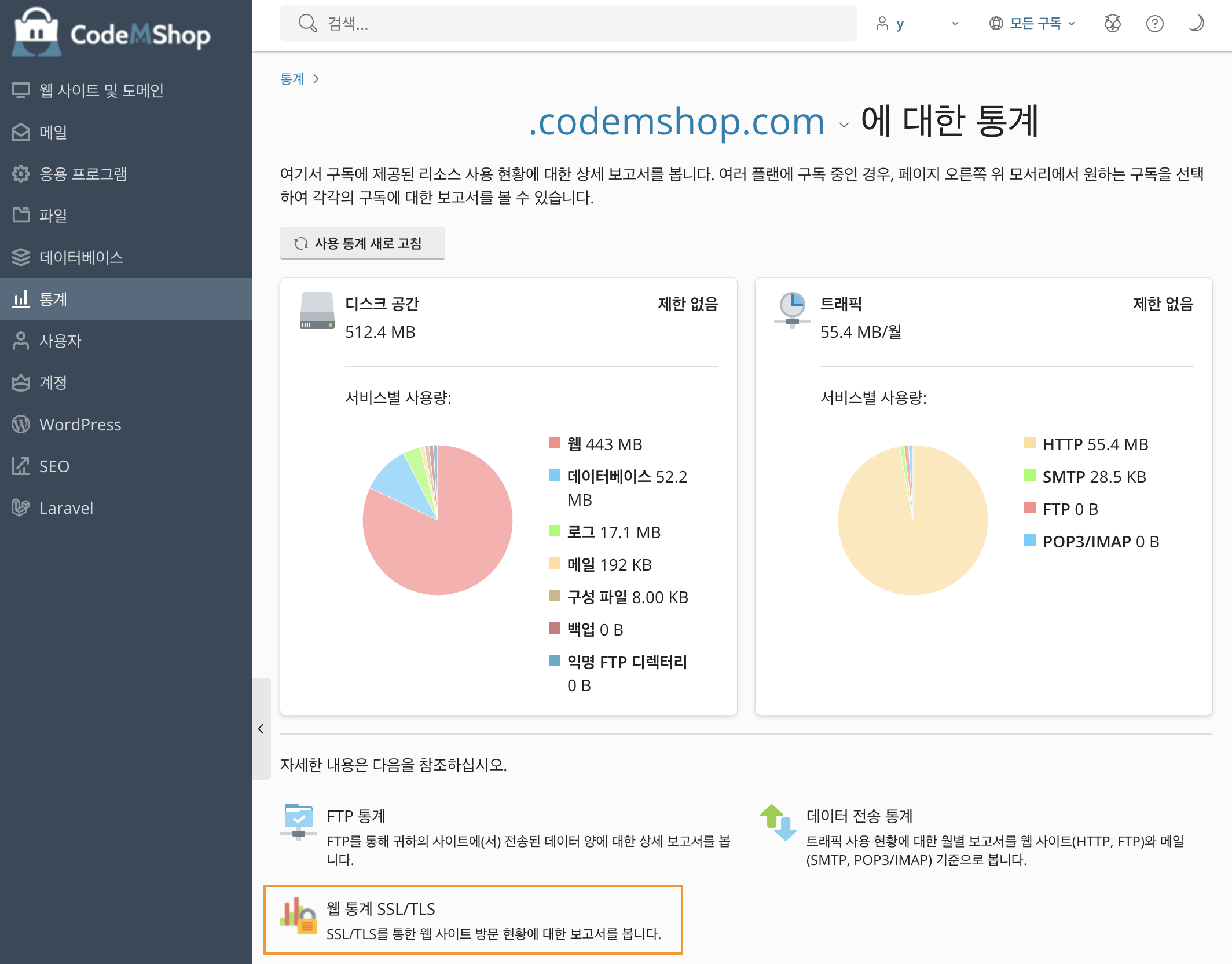 호스팅 관리 패널의 통계 메뉴에서 웹 통계 SSL/TLS를 클릭합니다.
