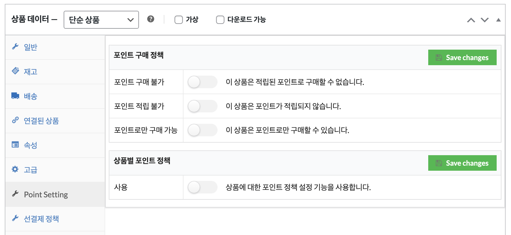 관리자 메뉴 [상품 관리 > 상품 편집 페이지 > 상품 데이터 메타박스 > Point Setting(탭)]에서 설정할 수 있습니다.