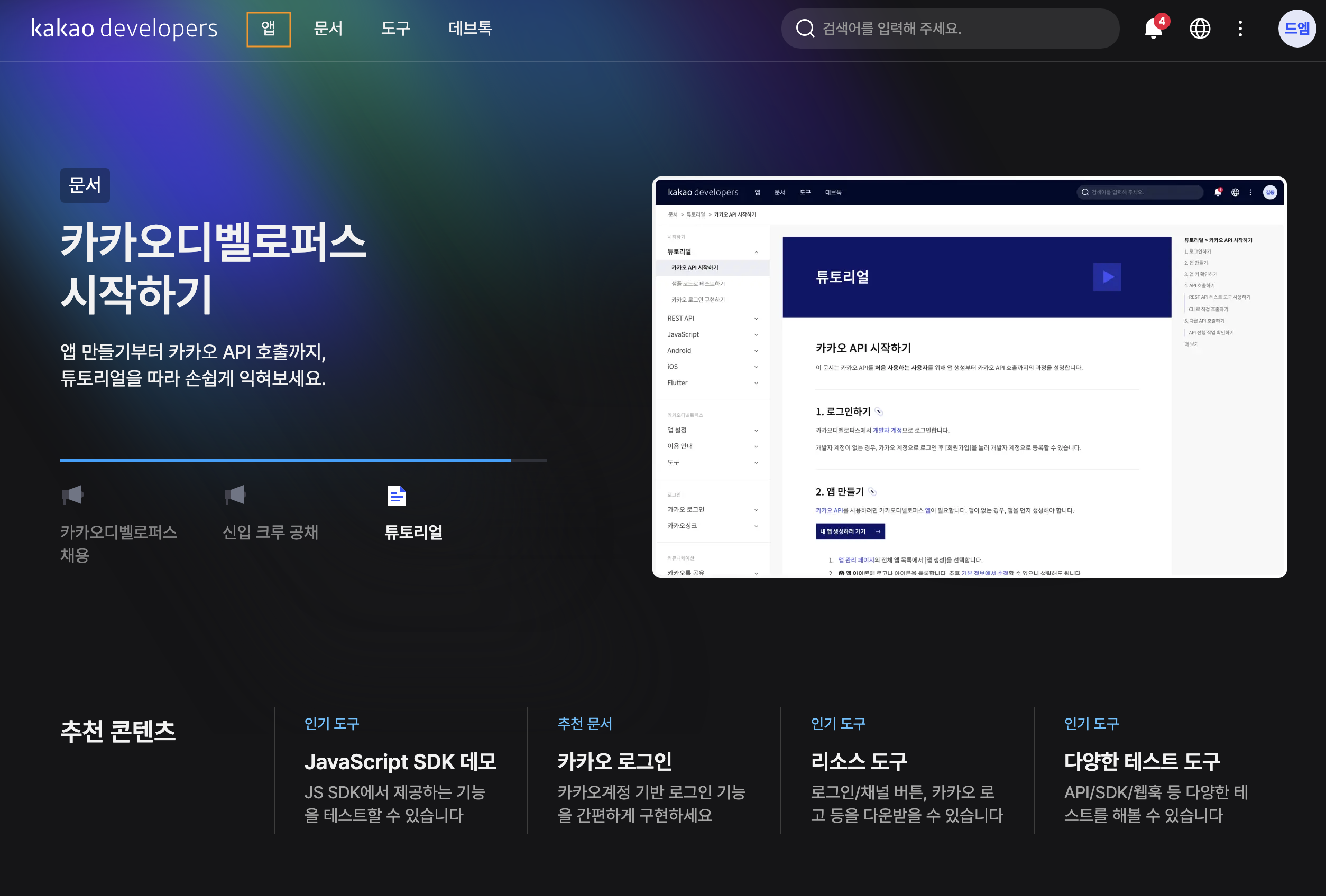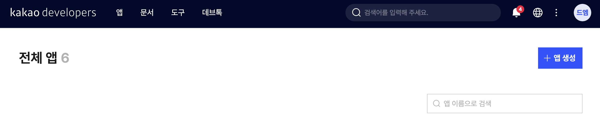 kakao developers 사이트에서 로그인한 후, 상단 좌측의 앱을 클릭합니다.