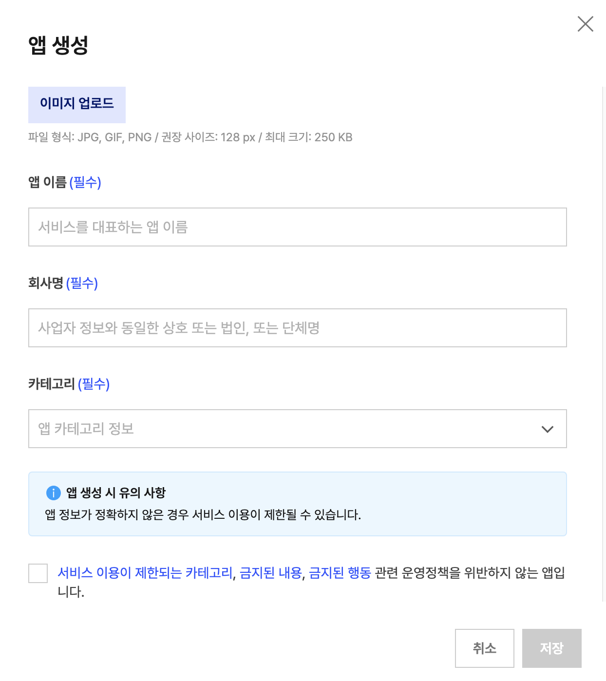 앱 아이콘, 앱 이름, 회사명 작성 및 카테고리를 지정하고 저장합니다.