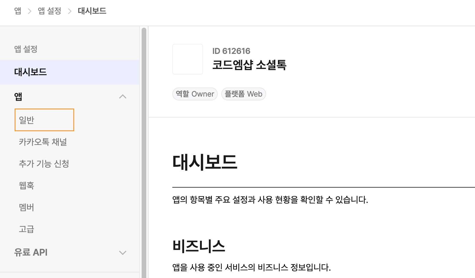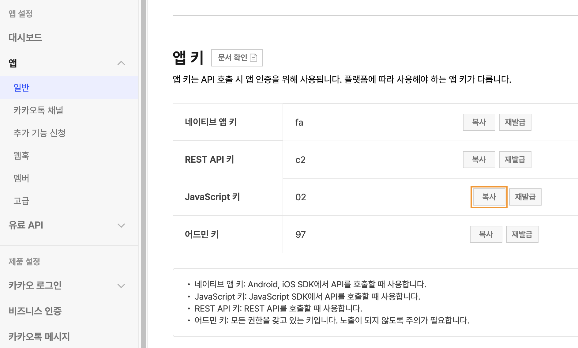 플랫폼 상단의 앱 키 영역에서 JavaScript 키를 복사한 후, 카카오톡 채널 설정 매뉴얼을 참고하여 카카오톡 채널 설정의 기본 설정 영역에 키를 입력합니다.