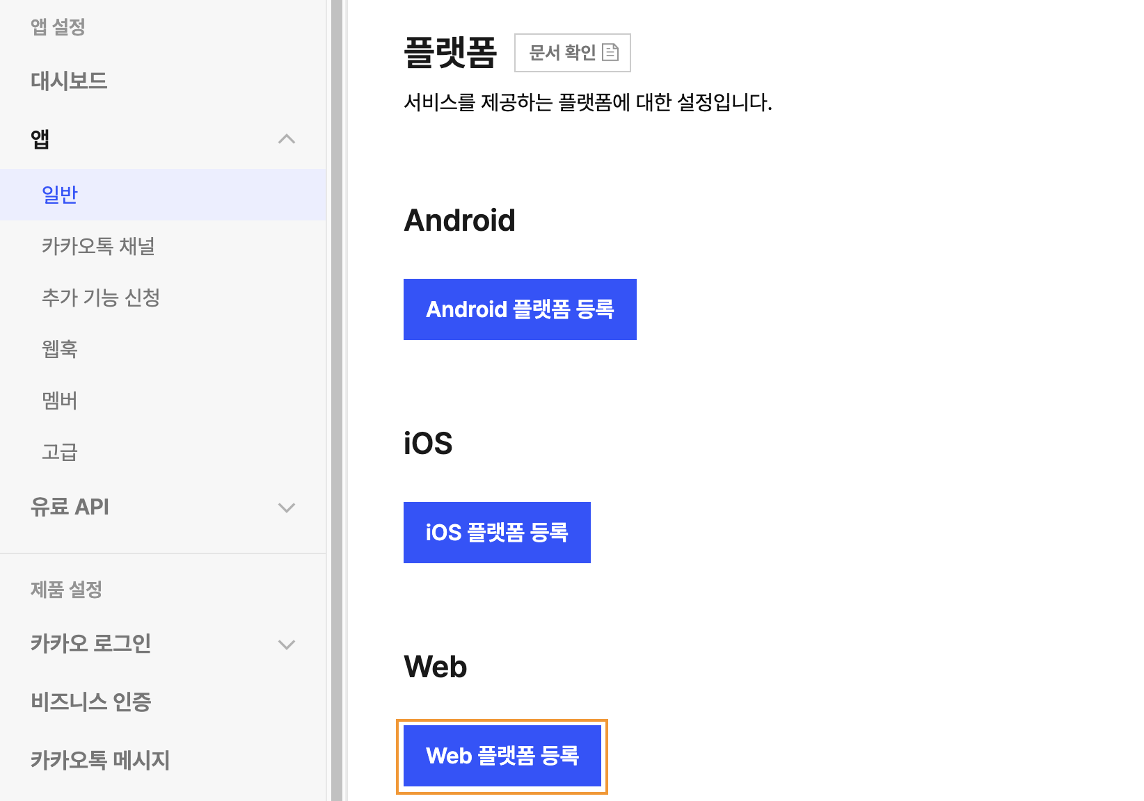 하단으로 스크롤하여 플랫폼 영역의 Web 플랫폼 등록 버튼을 클릭합니다.