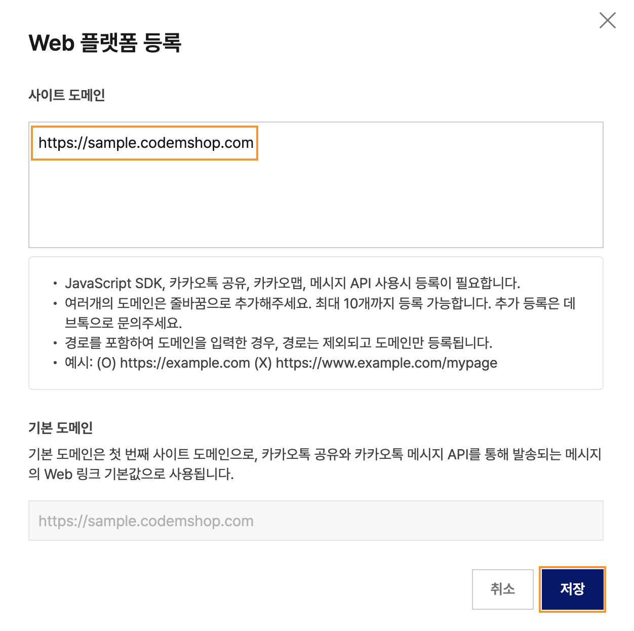 카카오 상담톡 기능을 이용할 도메인을 작성한 후, 저장 버튼을 클릭합니다.