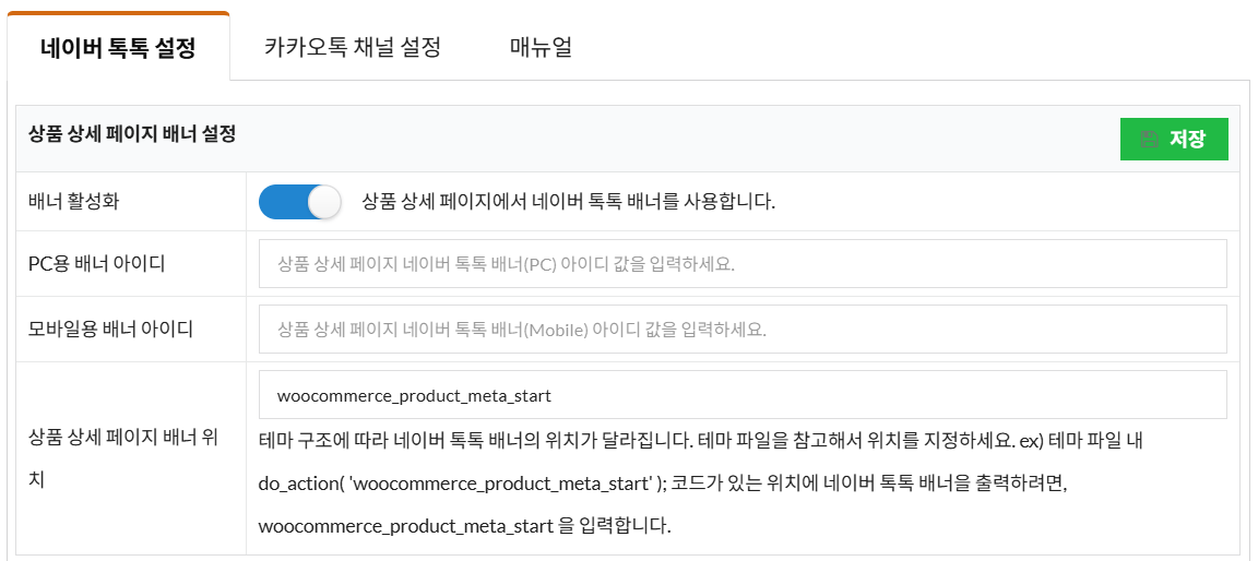 PC용 네이버톡톡 배너의 아이디를 입력합니다. 버튼의 아이디는 매뉴얼을 참고하여 배너 생성 후 입력합니다.