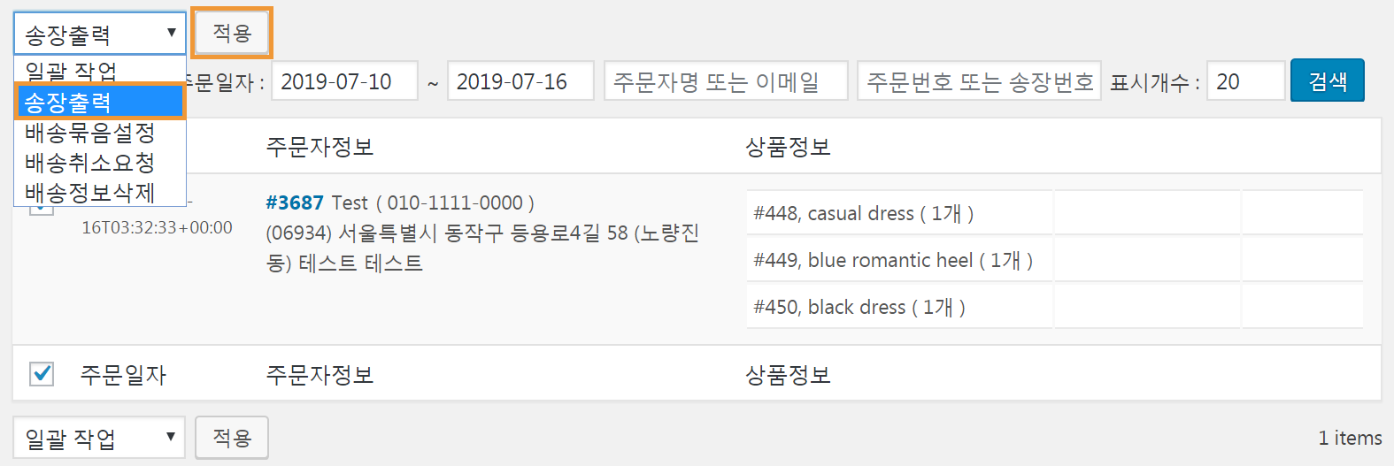 2. 송장출력을 선택하신 다음, 적용 버튼을 눌러주세요.