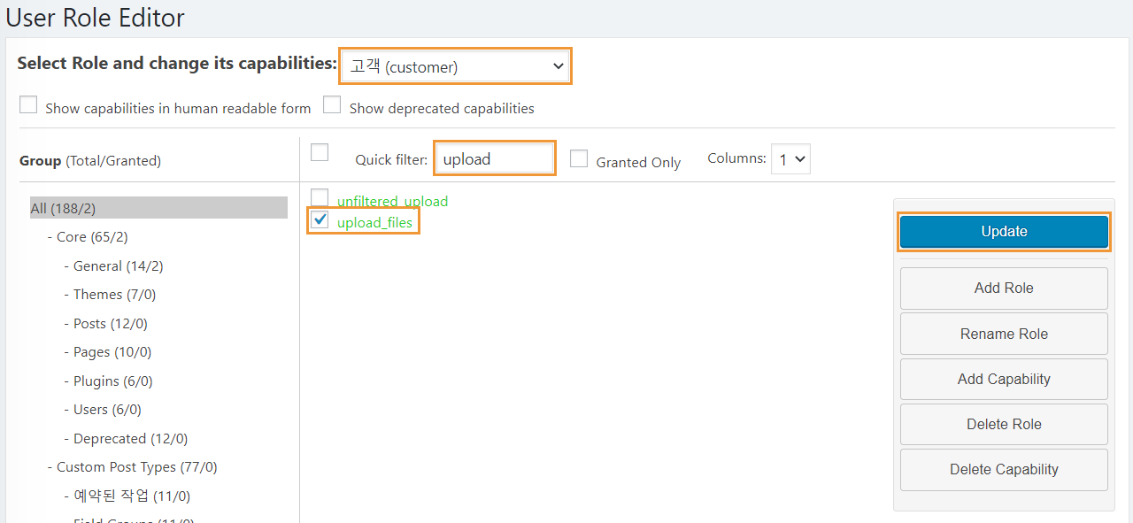 계정 등급을 선택 > upload를 검색 > upload_files 권한을 부여합니다.