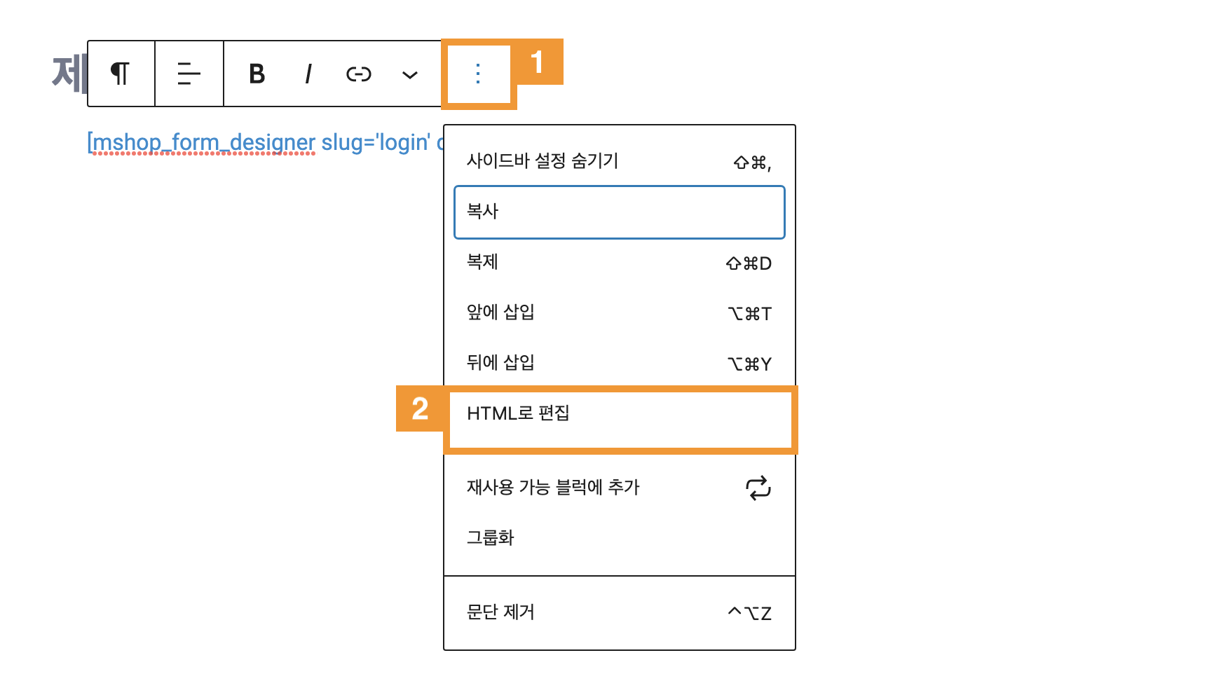 - 숏코드 추가 시 아래 이미지처럼 파란색 글씨가 된다면 더 보기 아이콘 클릭 후 HTML로 편집을 클릭하여 외부에 있는 태그를 삭제해주시기 바랍니다.