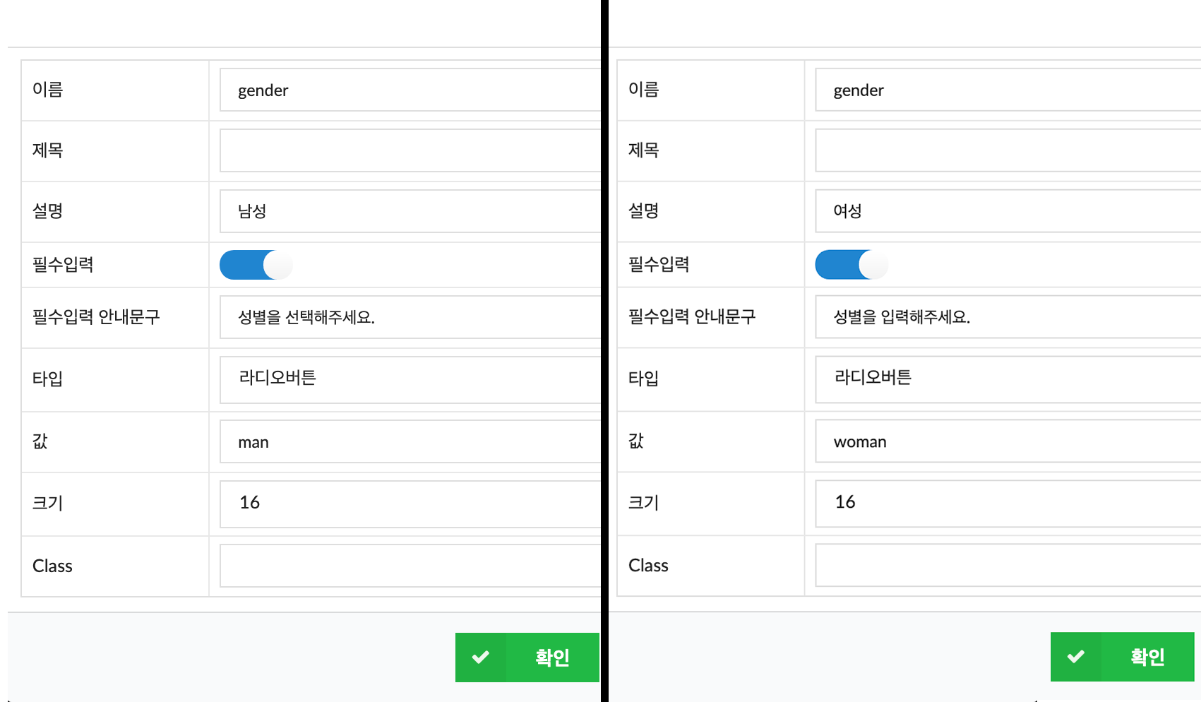 - 필드의 이름을 지정합니다. 해당 영역은 같아야 합니다.