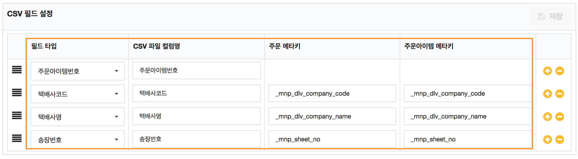 CSV 필드 설정을 아래 사진과 같이 “주문아이템번호, 택배사코드, 택배사명, 송장번호”순서대로 설정한 경우