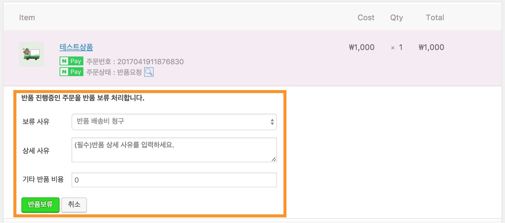 - 반품보류 사유 정보를 입력하고 “반품보류”버튼을 클릭해 반품 보류 처리를 진행합니다.