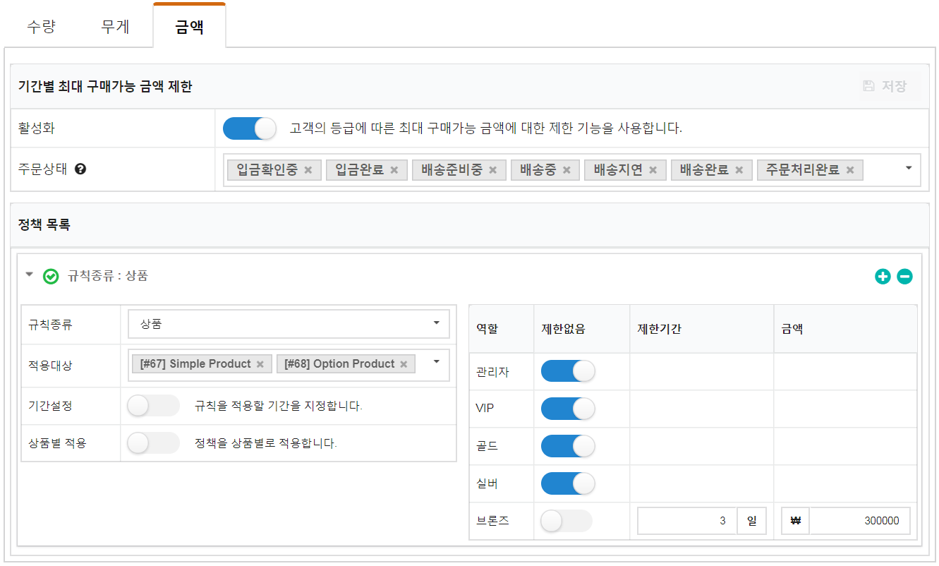 - 금액 탭에서는 등급별로 일정 기간동안 구매 가능한 상품의 최대 금액을 지정할 수 있습니다.