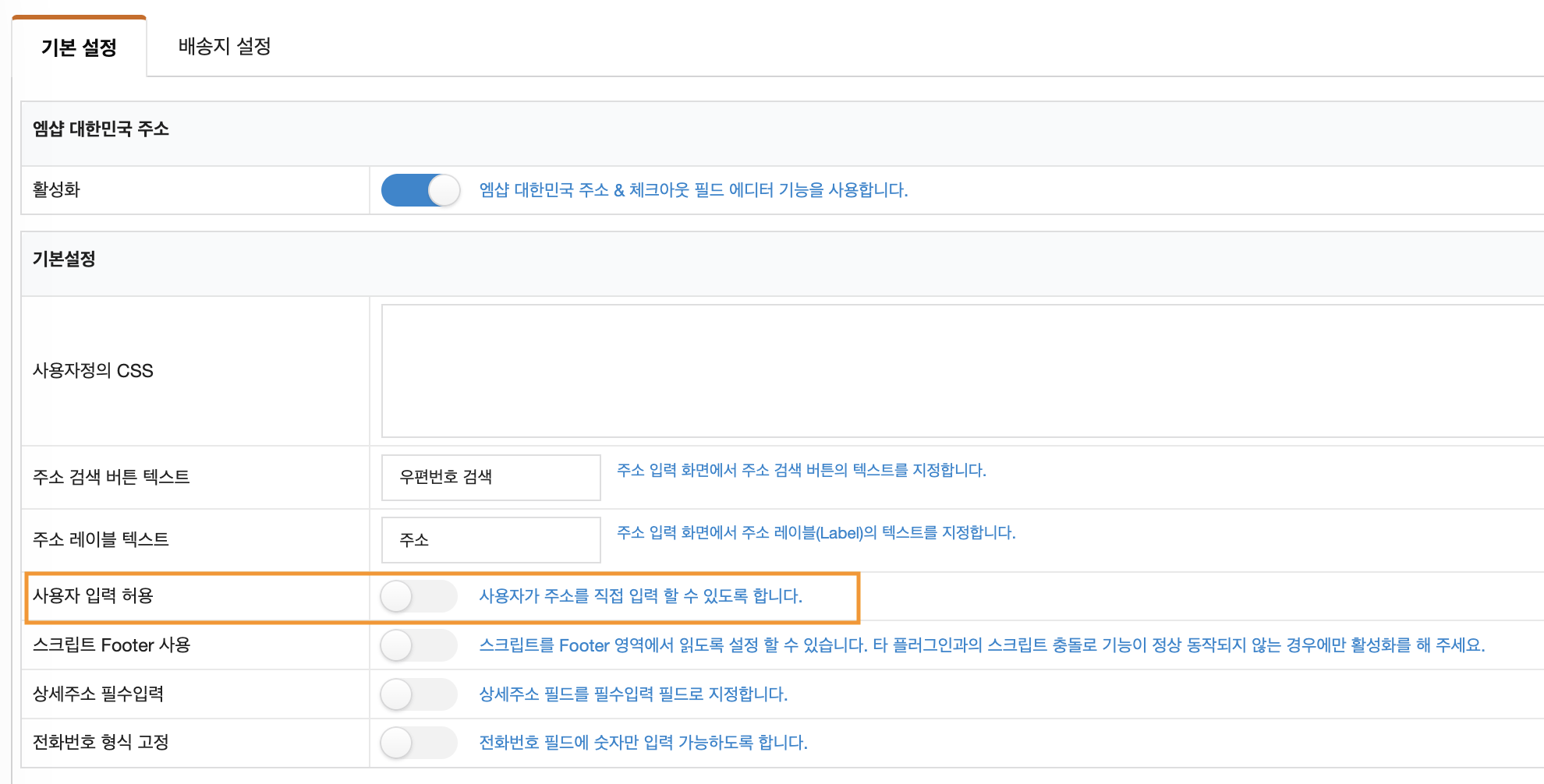 2. 관리자 메뉴 – 엠샵 주소 체크아웃 > 기본설정 > 사용자 입력 허용 버튼 활성화