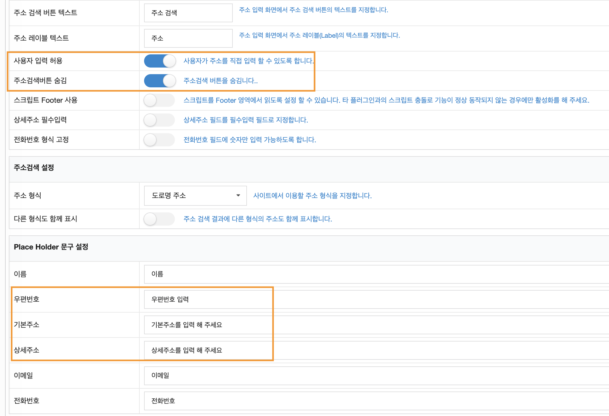 4. 우편번호, 기본주소, 상세주소 영역에 고객이 직접 주소를 입력할 수 있도록 안내 문구 작성 후 저장
