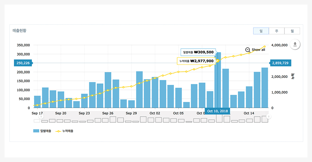 그래프 내 마우스 오버 시, 해당 시점의 매출 및 누적 매출을 확인 할 수 있어요.
